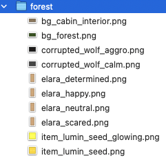 - name: bg_cabin_interior x: 0 y: 0 width: 1280 height: 720 color: "#8B7355" text: "Cabin Interior Background" font_size: 24 text_color: "#FFFFFF" - name: bg_forest x: 0 y: 0 width: 1280 height: 720 color: "#2D5016" text: "Forest Background" font_size: 24 text_color: "#FFFFFF" # Characters - Elara (Left/center positioning) - name: elara_neutral x: 320 y: 110 width: 300 height: 500 color: "#D4A574" text: "Elara (Neutral)" font_size: 18 text_color: "#FFFFFF" ... ...forest_scene_asset_guide.md
