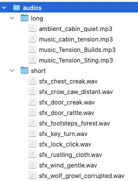 - name: sfx_rustling_cloth.wav description: "" - name: sfx_wind_gentle.wav description: "" - name: sfx_footsteps_forest.wav description: "" - name: sfx_crow_caw_distant.wav description: "" - name: sfx_wolf_growl_corrupted.wav description: "" - name: music_Tension_Builds.mp3 description: "A slow-building, suspenseful track" - name: music_Tension_Sting.mp3 description: "A short, sharp, startling sound"forest_scene_layers.yaml