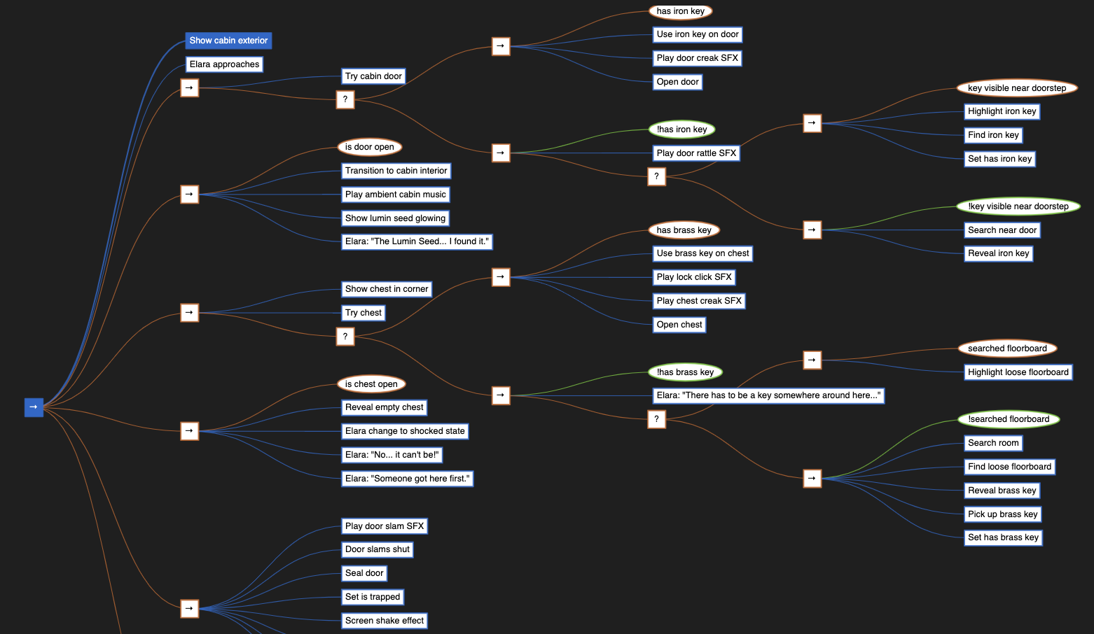 local model = { name = "cabinScene", components = { layers = { "bg_cabin.png", "elara_neutral.png", "elara_scared.png", "elara_determined.png", "elara_happy.png", "lumin_seed_normal.png", "lumin_seed_glowing.png", "lumin_seed_dim.png", "lumin_seed_pulsing.png", "door_open.png", "door_closed.png", "door_broken.png", "chest_locked.png", "chest_unlocked.png", "chest_open.png", "chest_empty.png" }, audios = { long = {}, short = { "door_rattle", "door_creak", "key_turn", "chest_open", "door_slam" } }, groups = {}, timers = {}, variables = { "hasKey", "hasMagicKey", "chestLooted" }, joints = {}, page = {} }, -- Actions only commands = { "setHasKey", }, }conversion to dialogue